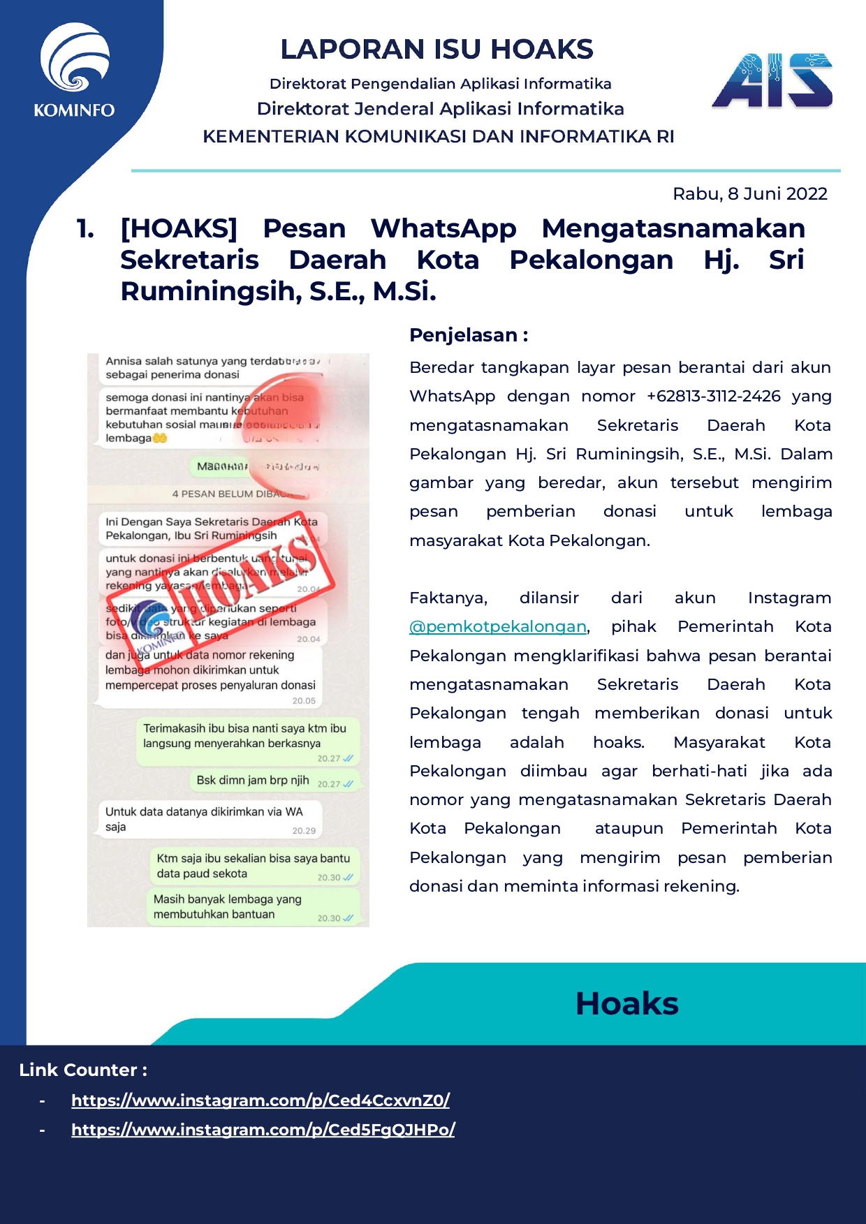 Beredar tangkapan layar pesan berantai dari akun WhatsApp dengan nomor +62813-3112-2426 yang mengatasnamakan Sekretaris Daerah Kota Pekalongan Hj. Sri Ruminingsih, S.E., M.Si. Dalam gambar yang beredar, akun tersebut mengirim pesan pemberian donasi untuk lembaga masyarakat Kota Pekalongan.