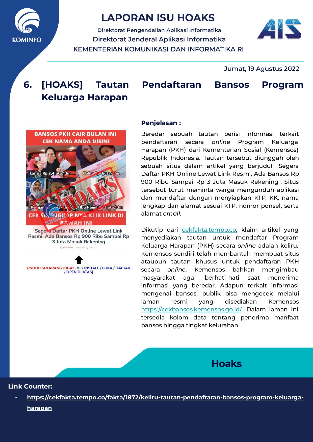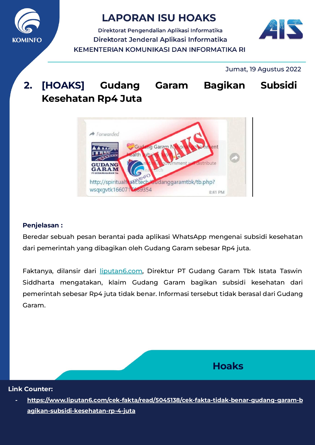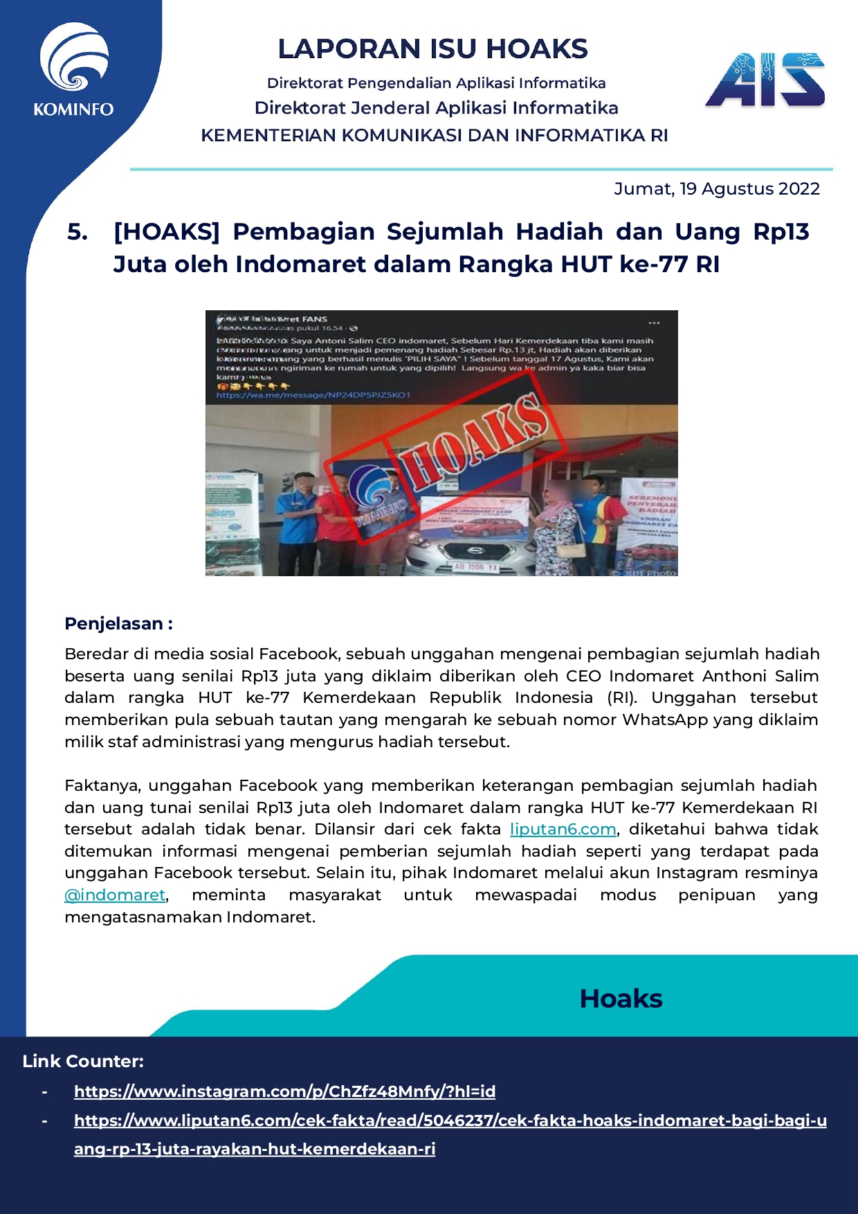 Rilis Hoax Harian Tanggal 19 Agustus 2022